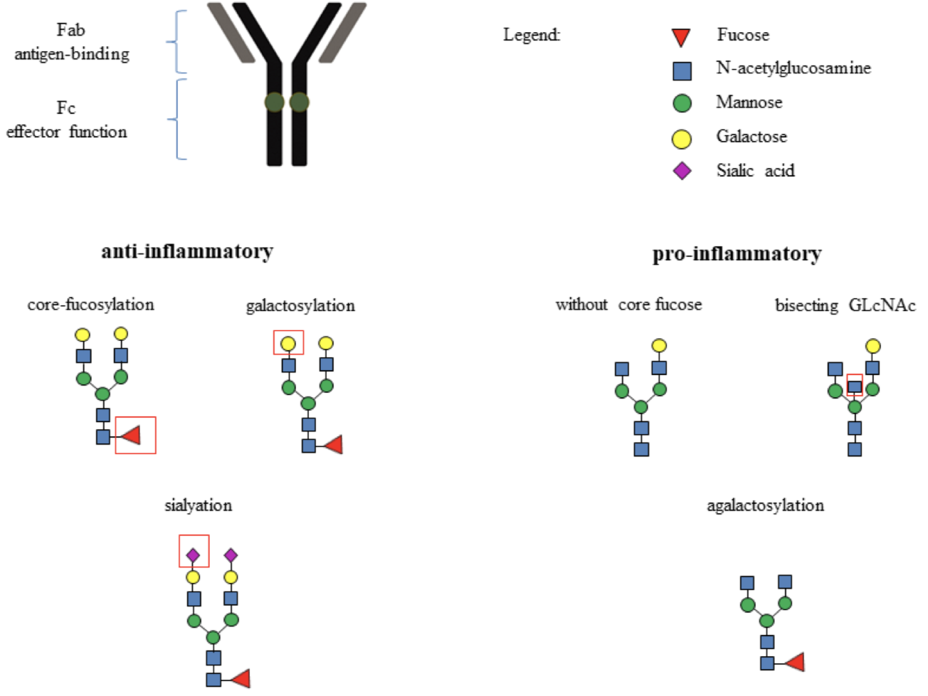 Authors of this study found that certain IgG glycan structures associated with biological ageing and described as proinflammatory (monosialylation, bisecting GlcNAc and fucosylation with bisecting GlcNAc) showed a correlation with a more rapid decrease of estimated glomerular filtration rate during 7 years of follow-up, while other structure which is known to act as a protective switch against immune response caused cell damage (fucosylation without bisecting GlcNAc) correlated with a lower rate of estimated glomerular filtration rate decline during 7 years of follow-up.