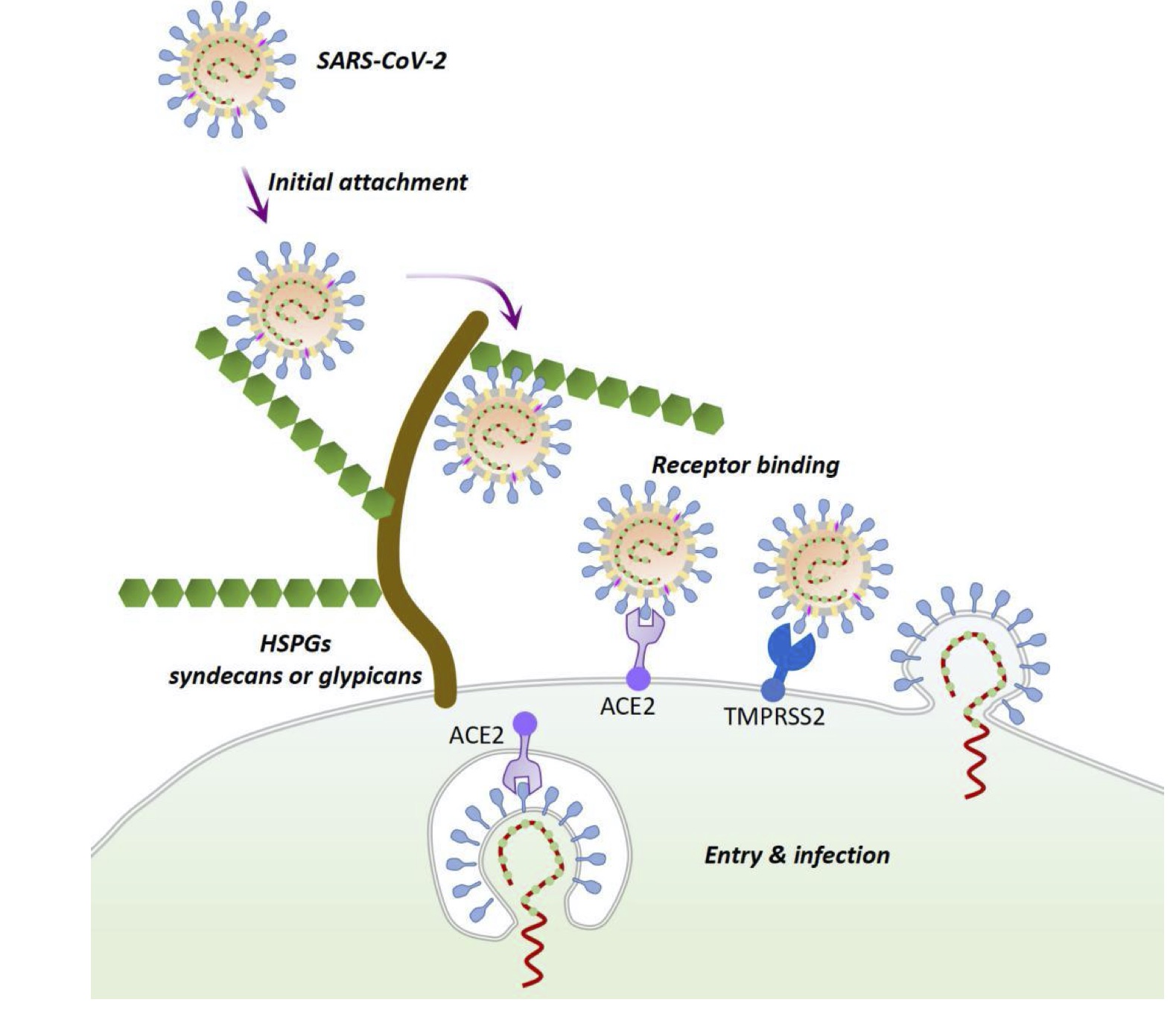 Fig 1. A possible mechanism for SARS-CoV-2 entry and infection through interaction with heparan sulfate proteoglycans [6].
