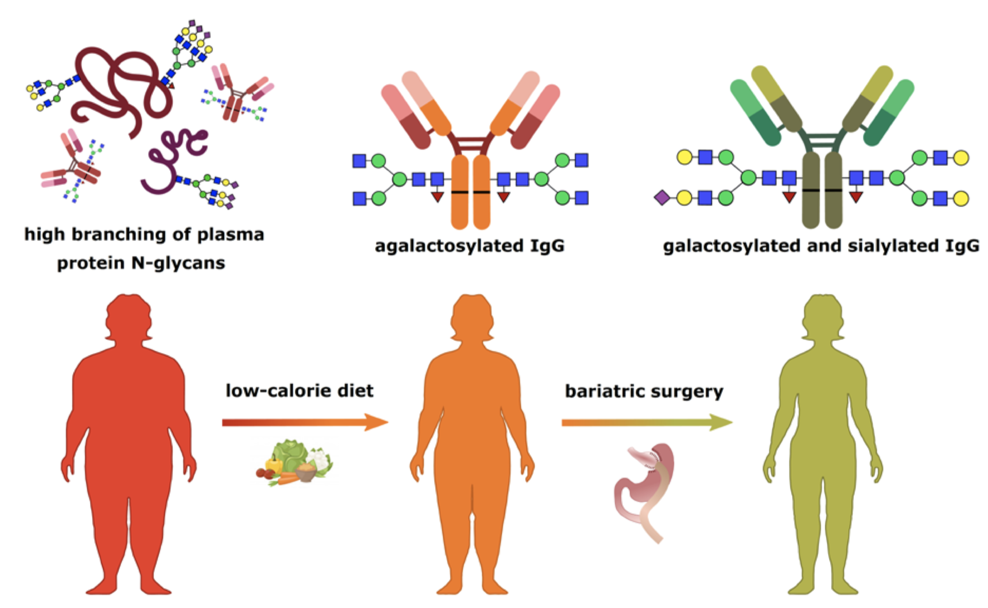 In our latest paper, publish on medRxiv, we performed glycan analysis on a large study in 2,000 twins followed and sampled repeatedly through 20 years, with their weight changes being monitored throughout the entire period. We have also performed the same analysis in a cohort of obese patients undergoing bariatric surgery. Resulting BMI decrease, either from dieting and exercising or bariatric surgery, influenced and changed the subjects’ glycans, transforming them from pro- to anti-inflammatory and making them ‘’younger’’. All of this led to the reduction of their biological age, also known as GlycanAge.