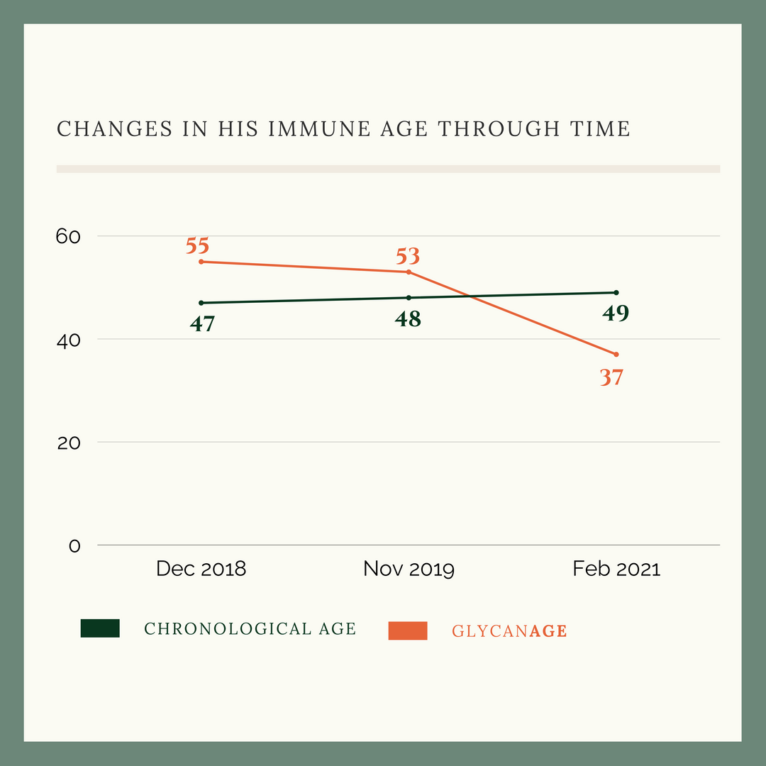 Basically, in 18 months, I improved my biological age by 18 years. I went from 55 to 37 and I’m so happy to see all the changes I made paid off. I was really encouraged by the last two GlycanAge tests and I want to stay persistent in my health journey.