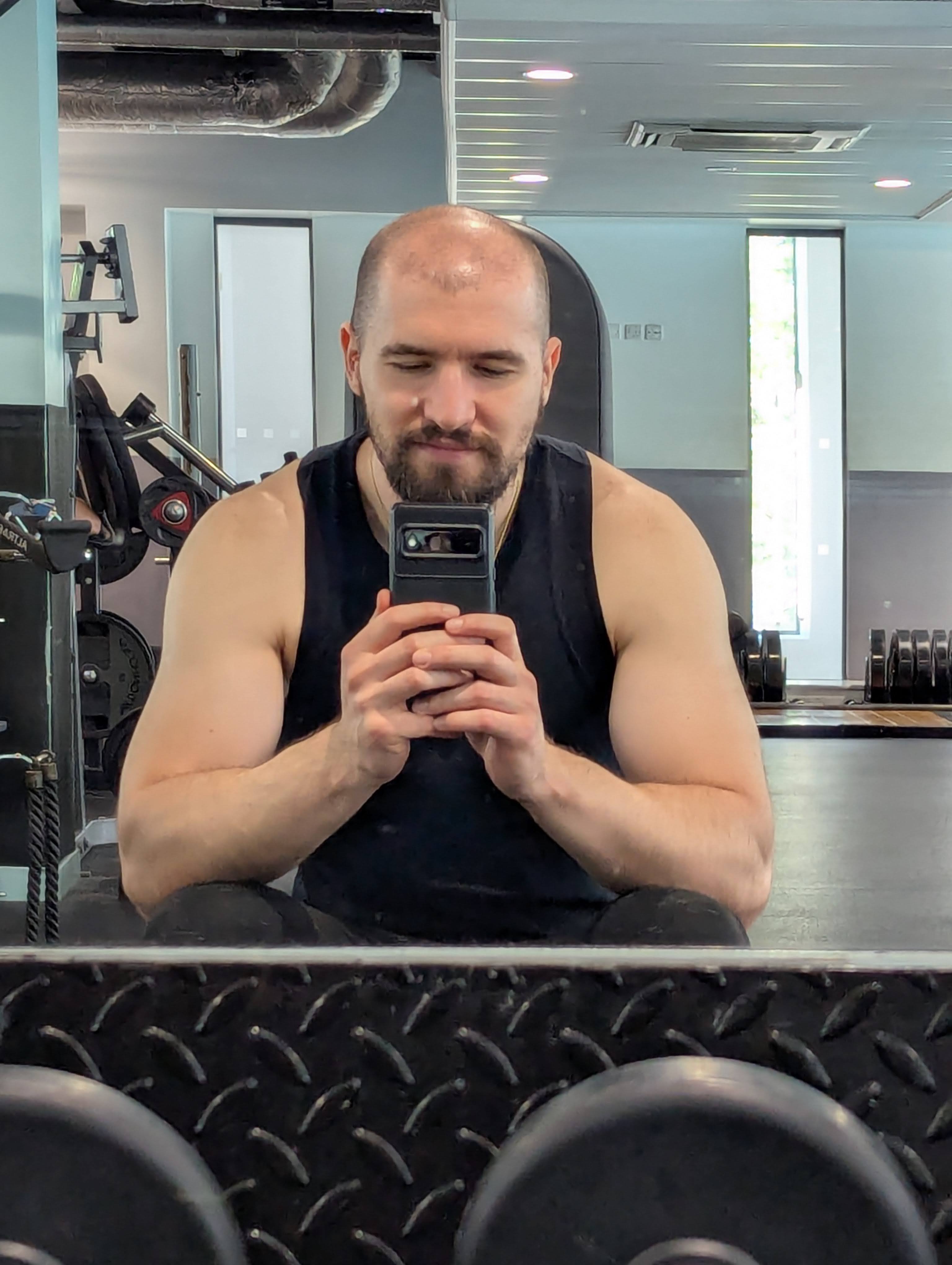 I do four different exercises each day. If it's a compound movement, I'm going to do only two sets, but I'll put as much weight as I can and push myself to failure in both of those sets. For isolation exercises, I do three sets, because it's usually smaller muscle groups and they can handle a bit more load. It's all very kind of calculated, and I've been journaling all of this, writing everything down, talking with myself, talking with AI, and going through it all the time, analyzing my progress. I've also been making sure to weigh myself. Over the course of a year, I've managed to gain roughly four kilos, which is pretty good.