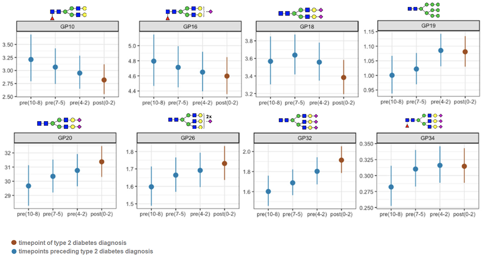 The results also highlight a continuous deterioration of the glycan profile over time, reflecting the gradual progression toward disease.